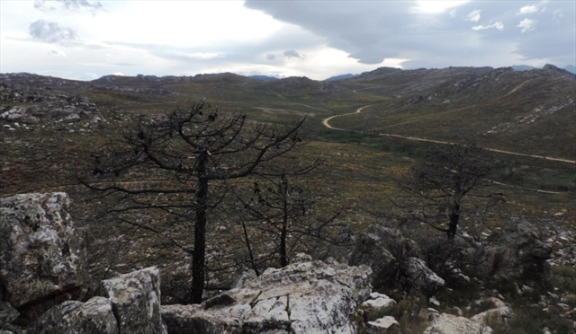 Cuervo, Peña del (1025 m) : Vista de la Peña del Tesoro y el Camino de Fornillos subiendo hacia Hito Nuevo desde la Peña del Cuervo en el Serrato los Cabritos