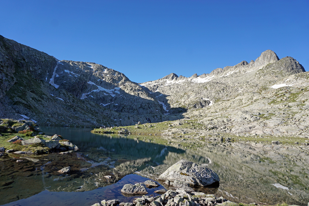Turon de Néouvielle (3035 m) : Bordeando el lac Estalat apreciamos al fondo la Coume Estrète con nieve en el límite de la sombra