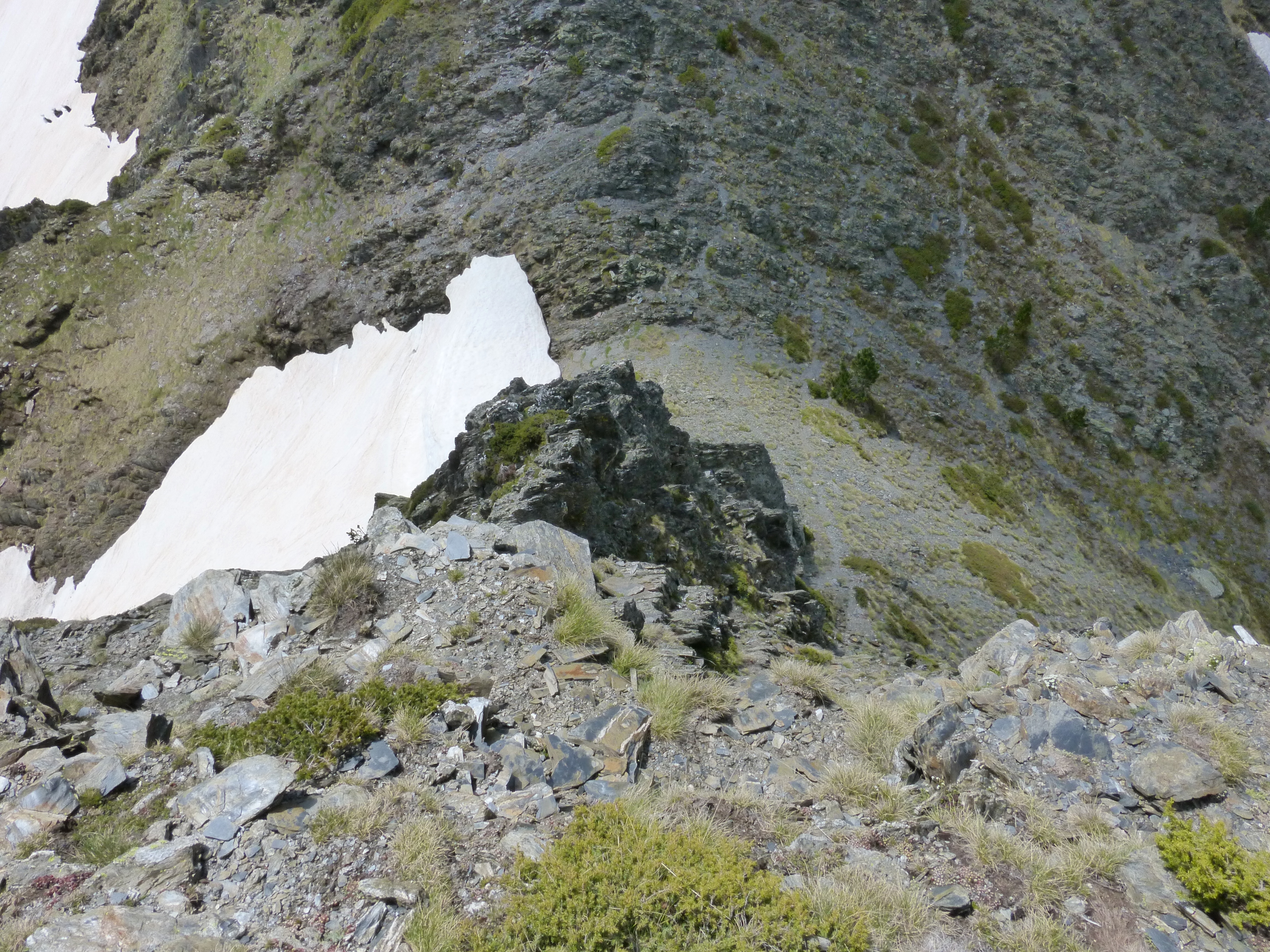 Recorriendo la Serra del Ras el terreno sólo se presenta abrupto aquí: en la bajada a la horcada anónima que sigue a la Collada del Cap del Ras.