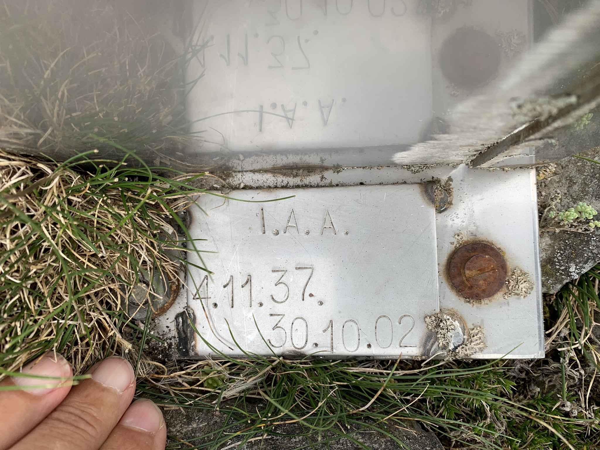 Buzón, I.A.A. 4.11.37 - 30.10.02, probablemente colocado en memoria de un montañero, según reza la chapa en su lateral